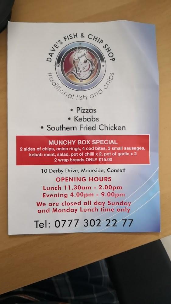 Situated at 12 Derby Dr, Consett DH8 8DB, Dave's Fish & Chips is a beloved local gem. This restaurant, known for its vibrant chippy vibe, embraces an accessible and friendly atmosphere suitable for all ages. The establishment prides itself on its community roots, serving up not just meals, but experiences. Families often gather here for pleasant lunches or dinners; the kids' menu is a particular highlight that keeps young diners happy. The restaurant is wheelchair accessible and offers various dining options including takeaway and delivery. Open seven days a week, it's a reliable choice for consistent, and delicious fare, especially for those camping nearby who return time and again for a taste of home. The free on-street parking makes visiting hassle-free, and those who dine here frequently rave about the friendly staff who treat everyone like family.